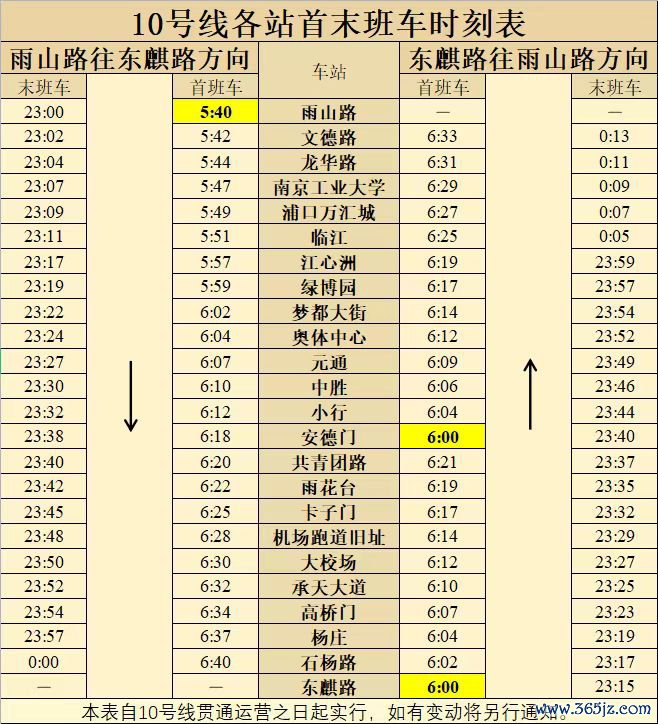 10号线全线贯通明,使命日早、晚岑岭接管大小交路的行车组织花样,大交路为雨山路至东麒路,小交路为雨山路至大校场;使命日其他时段及周末接管雨山路至东麒路单一交路的行车组织花样。往雨山路办法,东麒路、安德门站设首班车,于6:00同期发出;往东麒路办法,雨山路首班车5:40发出。末班车自雨山路于23:00、自东麒路于23:15发出。