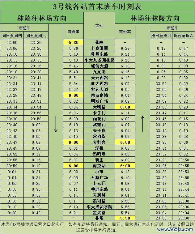 3号线全线贯通明,使命日早、晚岑岭及周末接管大小交路的行车组织花样,大交路为林场至秣陵,小交路为林场至胜太西路;使命日平峰期接管林场至秣陵单一交路的行车组织花样。往秣陵办法,林场首班车5:50发出,南京站、大行宫、大明路首班车6:00同期发出;往林场办法,秣陵首班车5:35发出、南京南站、大行宫、南京站首班车6:00同期发出。周日至周四末班车于23:00自林场、23:05自秣陵发出,周五至周六末班车于23:30自林场、23:25自秣陵发出。